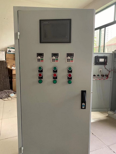 PLC觸摸屏變頻控制柜中包括裝置本體,裝置本體的頂部設(shè)置有頂板,頂板采用軟塑鋼材料制成的,其表面涂有防腐蝕涂料,裝置本體的正面設(shè)置有柜門,柜門表面安裝有液晶觸控屏,液晶觸控屏采用電容屏幕制成,PLC控制器與觸摸顯示屏相連接,傳感器安裝在供水管路上,變頻器與供水泵組相連接。 液晶觸控屏的底部設(shè)置有若干控制按鍵,控制按鍵與裝置本體信號(hào)相連接,裝置本體的底部設(shè)置有底板,底板的下部安裝有減震裝置,減震裝置的底部設(shè)置有底座,裝置本體的右側(cè)面裝設(shè)了警報(bào)燈,警報(bào)燈和裝置本體的信號(hào)相連接,裝置的本體里部裝設(shè)了若干掛板,掛板與裝置本體無縫焊接,掛板表面預(yù)留有若干掛鉤孔, 該P(yáng)LC觸摸屏變頻控制柜控制方便,安全性能越高,通過PLC可以支持遠(yuǎn)程控制,使用效率越高,使設(shè)備運(yùn)行流程及運(yùn)行狀況簡潔明了、形象直觀,各功能模塊及報(bào)警情況一目了然,方便使用和檢修,節(jié)能效果越加顯明。