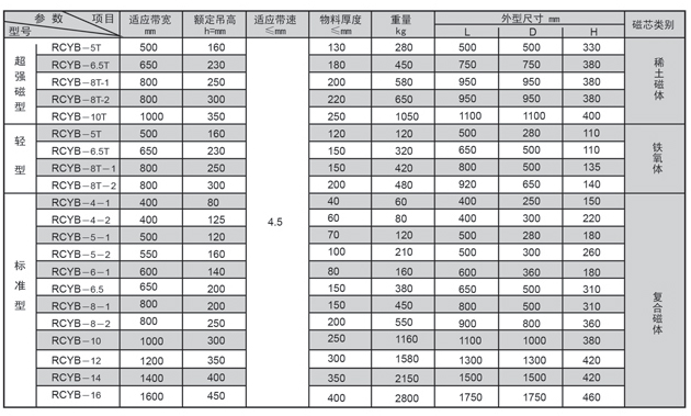 RCYB系列懸掛式永磁除鐵器內部采用高矯頑力,高剩磁的特殊永磁體“釹鐵硼”等材料組成復合磁系.具有免維護、磁力強、壽命長、安裝簡單、使用方便、運行可靠等優點,適用于皮帶機、振動輸送機、電磁振動給料機、下料溜槽上的非磁性物料中除鐵該產品各項技術指標均符合 JB/T8711—1998 標準當永磁鐵吸附磁物較多時,人工用非磁性刮板清除或載手套摘除.適用于連續工作,含鐵較少的場合。